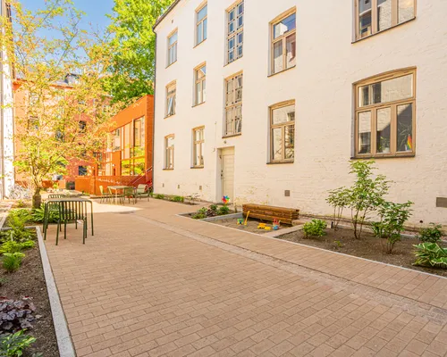 Da fasaderehabiliteringen sto helt ferdig, ble bakgården oppgradert for å bli en innbydende møteplass for beboerne.