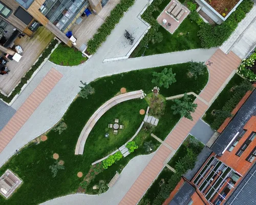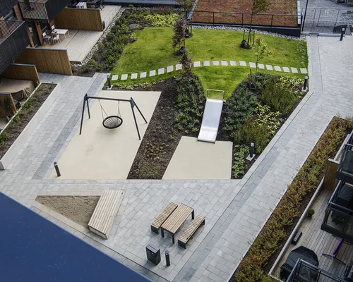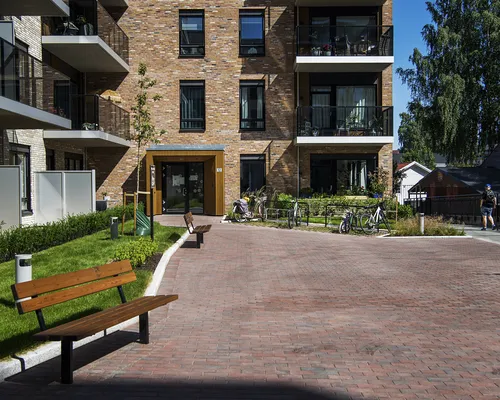 Her er det gjort et flott stykke arbeid av anleggsgartner Løvold AS - med stor lekeplass, blomsterbed og benker for sosiale samlinger. I 2022 ble prosjektet nominert til Lillestrøm kommunes arkitektur- og byggeskikkpris.