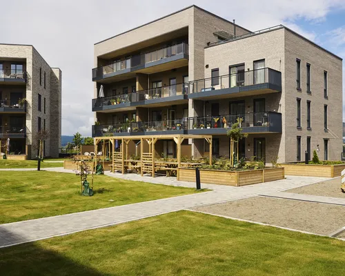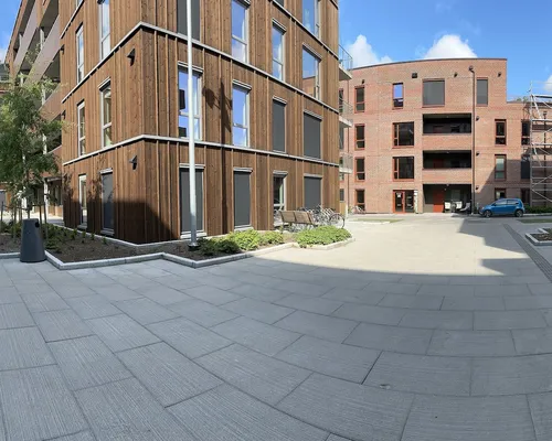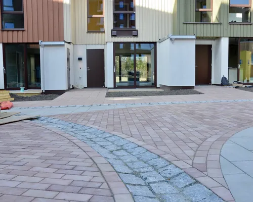 Et flott prosjekt hvor fargene ikke bare preger bygg, men også uterommet. En sammenhengende gangvei i fargene Blek Terrakotta, Trøffel og Sand fra vår Asak+Koi fargekolleksjon, kobler de ulike nabolagene sammen og skaper sosiale møteplasser underveis.