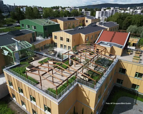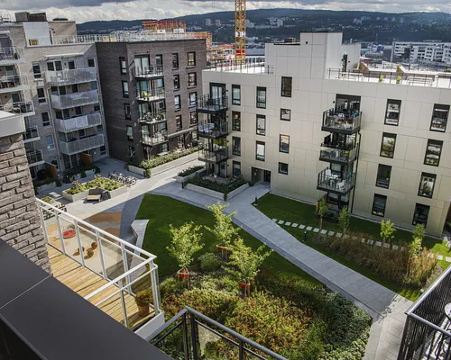 På Vollebekk har OBOS bygget flere nye boliger. Felles for disse er deilige grønne gårdsrom til glede for alle som bor der!
