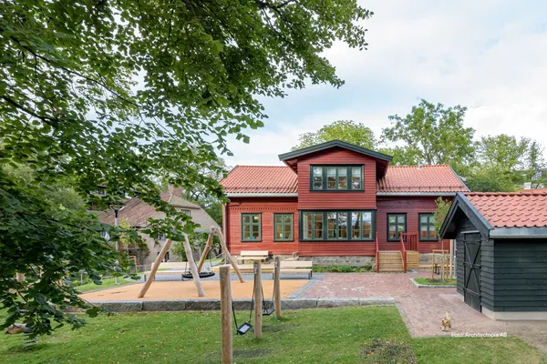 Barnehagen har bevart mye av den originale arkitekturen fra 1800-tallet, men er også tilpasset dagens krav til et trygt og stimulerende læringsmiljø. Den harmoniske blandingen av historie og moderne tilpasninger gir et unikt preg, og uteområdet spiller en viktig rolle i denne balansen. For å gi et funksjonelt og estetisk tiltalende uteområde har landskapsarkitekt Cecilie Kruse, benyttet belegningsstein i ulike farger, som både skaper visuell interesse og bidrar til et trivelig miljø.