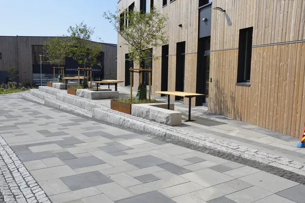 Det gir også muligheter for skating og annen lek. Plantefeltene ligger som «øyer» og er lagt slik at de samler opp og fordrøyer regnvann. Langs den sørvendte fasaden er det laget en sitteskulptur.